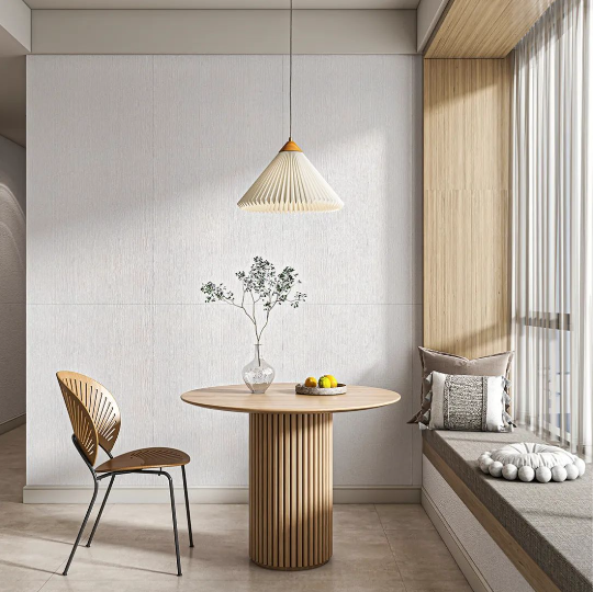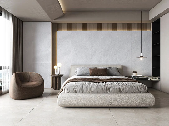 750X1500mm江月令化作臥室床頭背景墻,橫平豎直的線條結合黃金規格在空間中延伸。柔和燈光搭配原木風設計,賦予臥室更多的舒適自然之感。