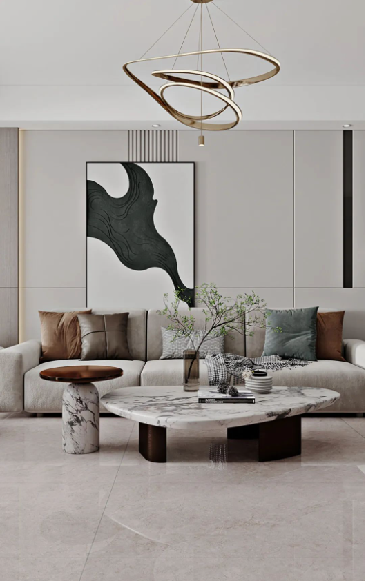 地面的主角哈爾施灰,飄逸的紋理,如無拘無束的靈魂,隨性優(yōu)雅。深淺不一的自然過渡,配合頗具檔次的不規(guī)則燈具、絨布沙發(fā)以及大膽有趣的抽象畫,讓空間充滿時(shí)尚,不落俗套。