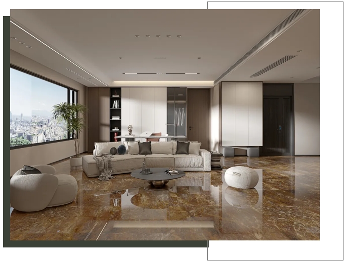 客廳選用【密爾沃】通鋪于地面,以灰色為客廳的主調,恣意流淌的精致紋理,與窗外陽光交織互動,呈現高級、沉穩的雅致氛圍。